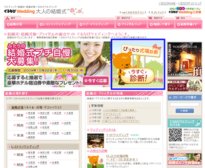 ぐるなびウエディングトップページ。青枠の部分に診断コンテンツの入り口がある