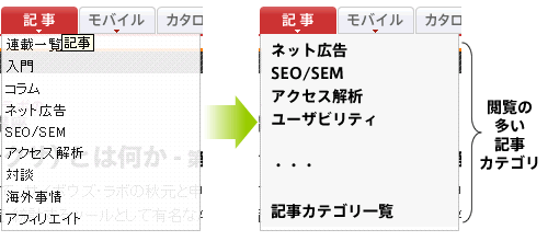 下図のように記事内容でカテゴライズして、よく閲覧されているカテゴリをマウスオーバーで表示されるメニューに入れるようにすると、関心のあるカテゴリからの記事の選択が容易になると考えられます。