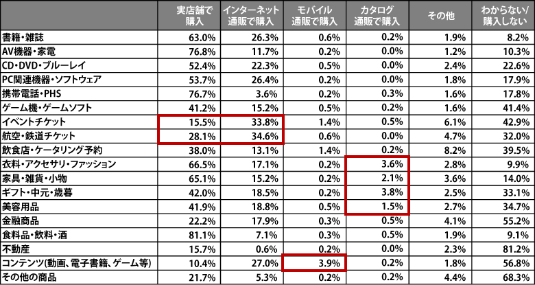 ほとんどの商品は、実店舗で購入するほうがまだ多いという結果になったが、その中でイベントチケットや航空・鉄道チケットはインターネット通販での購入の方が頻度は高かった。チケット関連はすでにリアルで買うよりも、インターネットにて購入することが定着しつつあるようだ。モバイル通販で購入されるものとしては、コンテンツ関連が中心となった。