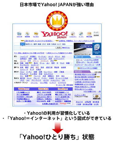 つまり、検索連動テレビCMが昨年流行ったように、消費者は興味・関心を持ったものに対して検索で情報を探し出すという行動が日常化している。検索をするという敷居が低いからこそクロスメディアは成り立つのだろうが、それは同時に特別な行為ではない、習慣化されているとも言える。一度習慣化されてしまうとそれを変える(変えさせる)のは難しいことで、「Yahoo!=インターネット」と捉えられていたといってもいい日本市場で「Yahoo!検索」の優位を揺るがすことは困難であろう。