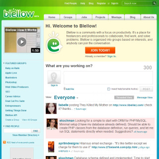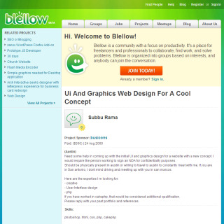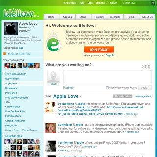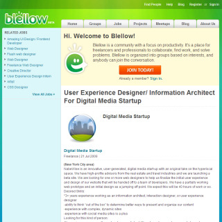 タブを見れば一目瞭然、「Group」でしょ、「Jobs」でしょ、「Projects」ときて、それに「Meetups」と、同好の士を集めたり、メンバーが勉強会を催したり、抱えている仕事をサポートしてくれる人を探したり、違う職種の人とコラボレートしたり、ミーティングやセミナー・イベントなどを告知したりしたい時に、他のフリーランスのメンバーに対してBlellow上で手早く発信できてしまう。これは、全く考えていた通りのことができてるんじゃないかってね。いや、参りましたね。