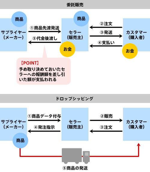 わかりやすいように委託販売とドロップシッピングを並べて図解にしたので、どの部分が異なっているのかよくご覧いただいて理解を深めていただければと思います。