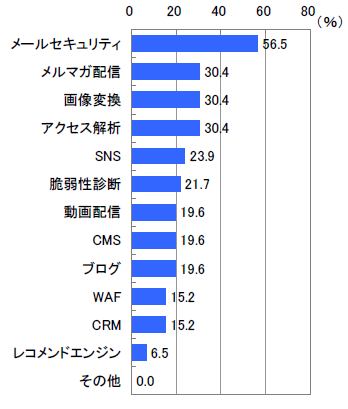 利用中もしくは導入を検討しているSaaSの内容を尋ねたところ、Webサービス系(53%)に比べ基幹系(74%)が多いことがわかりました。基幹系SaaSでは「スケジュール」(64%)が最も多く、次いで「メール」(59%)、「メールセキュリティ」(42%)となり、Webサービス系では「メールセキュリティ」(57%)が最も多く、次いで「メルマガ配信」「画像変換」「アクセス解析」(30%)となりました。
