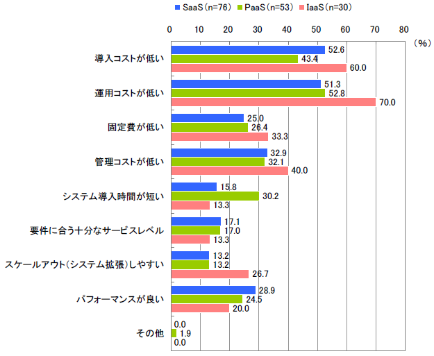導入を検討しているクラウドサービスに期待することを尋ねたところ、「SaaS」「PaaS」「IaaS」の全てにおいて「導入コストが低い」「運用コストが低い」といったコスト面に期待をしている企業が多く見られました。SalesforceやGoogle Apps、Amazon EC2など、安価で利用できることを強みとしているサービスが注目を浴びているためと推察できます。