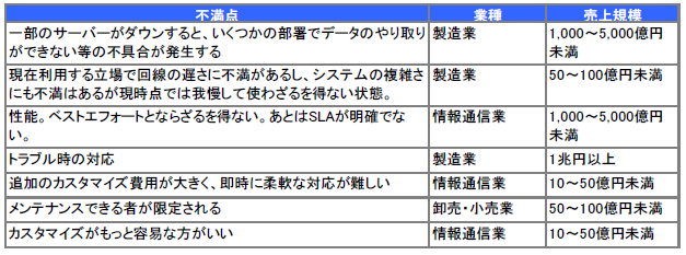 また、クラウドサービス利用企業に不満点を尋ねたところ、インフラの性能やサービスレベルについての不満の声があげられました。クラウドサービスを利用するにあたり、パフォーマンスの要件レベルやサービスレベルを確認するのも重要であることがうかがえます。