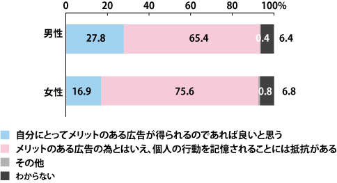 「自分にとってメリットのある広告が得られるのであれば良いと思う」と回答したユーザーは男性で27.8%なのに対し、女性では16.9%であり、約10ポイント以上男性の方が高い結果となっている。