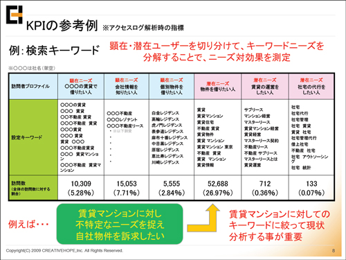 世の中には、顕在化されたニーズよりも潜在的なニーズの方が多いわけですから、ここでも「賃貸」「賃貸マンション」での検索ワードから入ってくる人の方が多いです。最近では、最初に潜在キーワードで来て、次に訪れる時には「○○不動産」といった顕在ワードで検索するユーザーが増えてきています。潜在ニーズを見極めて、顕在ニーズになるタイミングがどこかというのを調べて、対策を打つ必要性が出てきます。