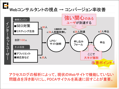 この場合は、申し込みフォームに改善のポイントがあると分かるわけです。場合によっては、申し込みフォームに至るまでの動線、いくつかのページを遷移するステップの中での離脱率が問題になることもあります。ですから、何が問題になっているのか、しっかりと見極めないといけません。
