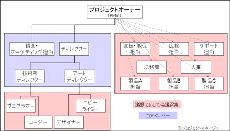 そこで石井氏が示したのが横断的プロジェクト体制のイメージ図だ。プロジェクトオーナーは、マーケティング、ディテクター、アートディテクター、技術系ディレクターというコアなメンバーをアサインし、さらに関係する専門家と社内各部署の代表が議題に応じて参加してもらい、足りない人材は社外から補うというもの。