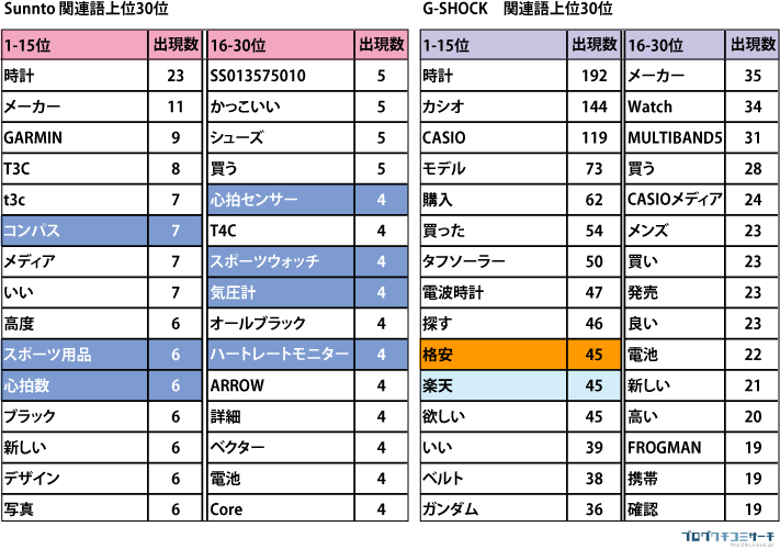 クチコミデータにより、それぞれの商品に特性があることが見えてくる。下記図2は同期間(2009年8月初旬から9月中旬)において、Sunnto、G-SHOCKと共に記載されている言葉(関連語)を集計した結果である。