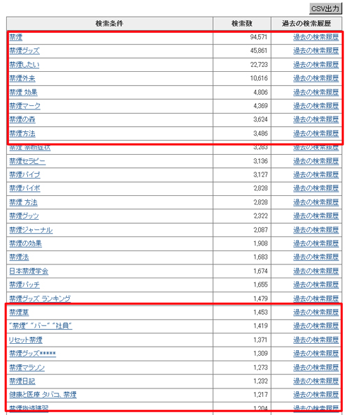 また、下位のキーワードにも注目して欲しい。前ページのキャプチャ画像を見ていただくとわかるように、「禁煙グッズ」「禁煙の仕方」…といったキーワードが並んでいる。これら下位のキーワードは順位は低いものの、まだ誰にも取られていないお宝キーワードが眠っている可能性も高い。
