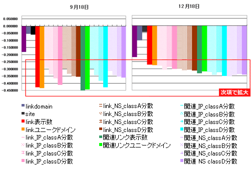 9月に比べlinkと順位の相関が強まっていることから、上位のサイトほどlink量が多い傾向にあると言える。しかし、「link:~」の検索結果として表示される項目の相関は弱まっている。その中では、相対的に関連リンクの相関は比較的高めが維持されている。