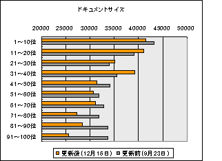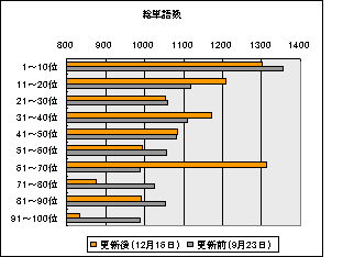 - 上位ほど総単語数が多い(※61位~70位にテキスト量が異様に多いページが1件含まれているためグラフに乱れあり)。