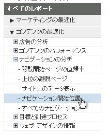 (1)対象となる1日を選択したら、左メニューから「すべてのレポート」→「コンテンツの最適化」→「ナビゲーション開始位置」をクリックします。