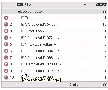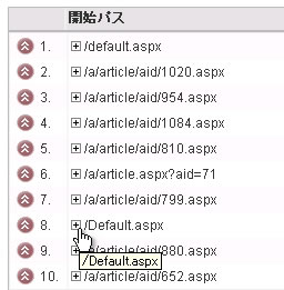 (2)自社サイトの中で、ユーザーがどのページから入ってきたかの一覧が表示されます。続いて、ユーザーがどのページに移動したのかを調べます。調べたい開始パスの「+」をクリックします。