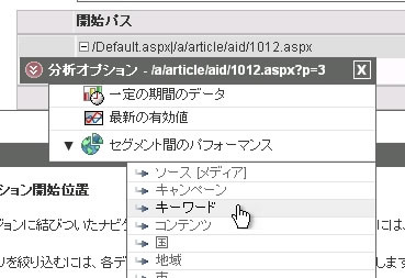 (5)分析オプションのメニューが表示されます。「セグメント間のパフォーマンス」→「キーワード」をクリックします。