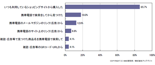それゆえプロモーションを展開する上では、いかにユーザーに自社サイトでの購入体験をしてもらうかというのが重要となる。先の調査を参照すると、いつも利用しているショッピングサイト以外の購入経路として挙げられているものとして、上から携帯電話での検索、メールマガジン、携帯サイトのリンク(広告)の順となっている。つまり、モバイル内でのプロモーションの方が効果を上げやすいといえる。