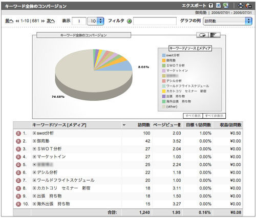「キーワード全体のコンバージョン」では、検索エンジン経由のアクセスを解析し、どんなキーワードで検索されたかを表示してくれます。