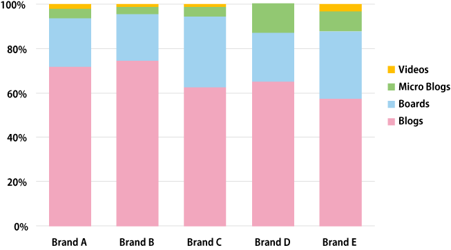 口コミがソーシャルメディア上のどのカテゴリー(ブログ、SNS、掲示板、動画共有サイト、マイクロブログなど)で行われているかを分析