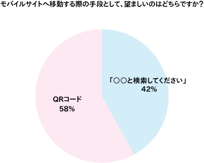 最後にQ6では、モバイルサイトへ移動する際に「QRコード」と「○○と検索してください」のどちらが良いと思うかを尋ねた。その結果、「QRコード」と回答したユーザーは58%、「○○と検索してください」は42%となっており、QRコードの方が高い支持を得ている事がわかった。