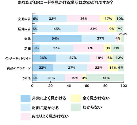 Q3では、Q2と同様にQ1で「QRコードを知らない」と回答したユーザー以外に対して、QRコードをどのような場所やモノで見かける事が多いかを尋ねた。「非常に良く見かける」という回答が最も多かったのは、「雑誌」で122人(53.7%)、次いで「パソコンのインターネットサイト」で60人(26.4%)、そして「商品のパッケージ」の52人(22.9%)と続く。「たまに見かける」では、「屋外広告」という回答が最も多く103人(45.3%)、次いで「パソコンのインターネット」、「商品のパッケージ」、「新聞」が85人(37.4%)の同率で並んでいる。