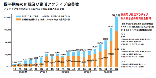 さて、購入金額の低下という結果だけ見ると、顧客離れが起こっているかのように見えるが、それは早計だ。同社は、効果的な広告宣伝施策と効率的な在庫供給により、新規、もしくは復活アクティブ会員の獲得に成功している。