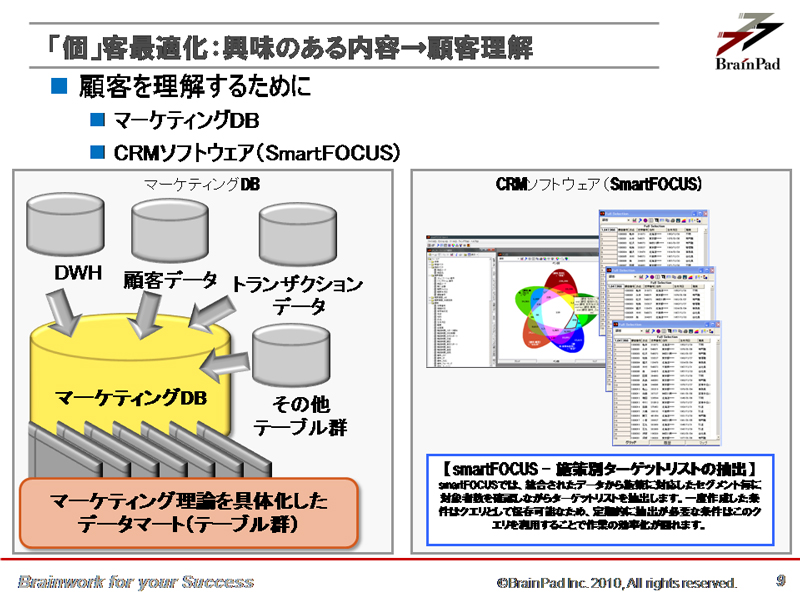 ただ、データだけでは活用しきれないので、弊社が提供している「SmartFOCUS」などのCRMソフトウェアを導入していただいて、短時間で簡単に個客分析をできるようにしていただくのがよろしいかなと思います。
