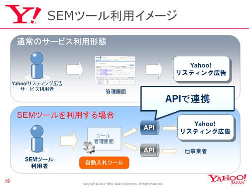 もう1つのメリットとして、ヤフー以外のリスティング広告サービスとも連携させることで、包括的にリスティング広告運用を管理することが可能となります。図のイメージのように、APIを使った包括的な入札管理ツールを用意すれば、複数サービスの数値を1画面でまとめて見るといったことができ、日々の運用が楽になるのではないでしょうか。