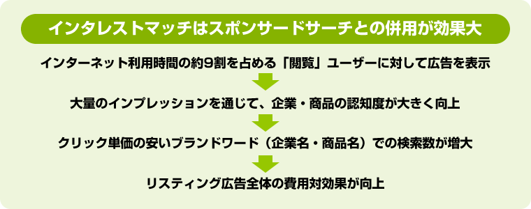 ニーズが明確になっているインターネットユーザーには「スポンサードサーチ」でピンポイントに訴求。潜在的な興味関心を持つユーザーには「インタレストマッチ」で幅広くニーズを喚起します。