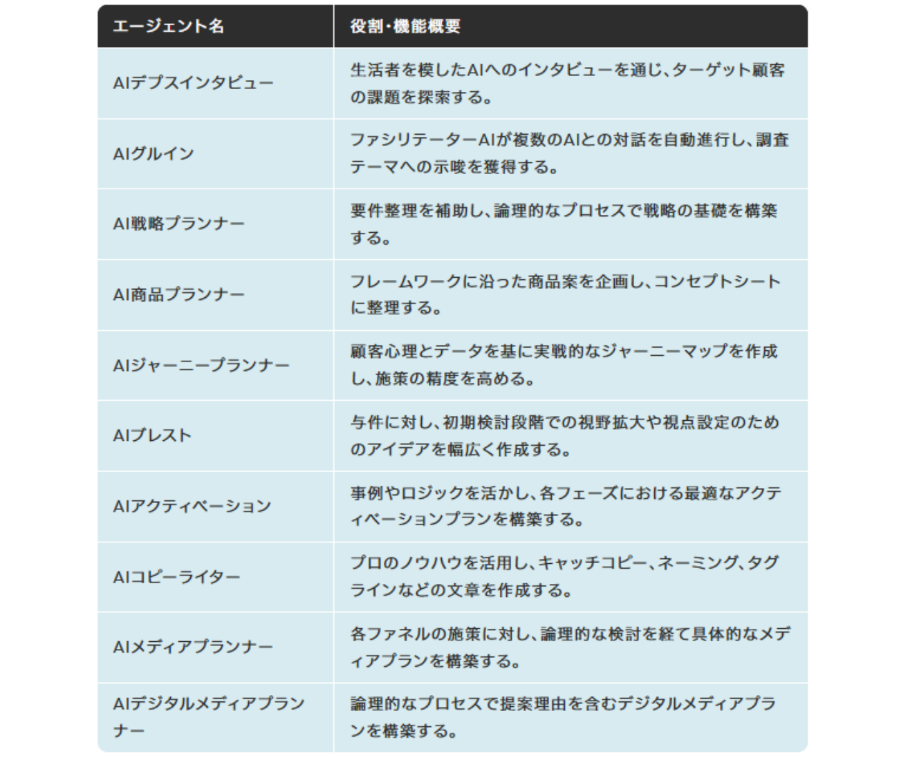 各AIエージェントは、国内電通グループが保有する生活者調査データやプランナー/クリエイターの思考プロセス、ナレッジを学習させた、マーケティング実務に特化したものだ。「AI For Growth Canvas」上で各エージェントがシームレスに連携しており、対話を通じて生活者のインサイト発見・戦略立案からコンセプト開発・施策検討、クリエイティブ制作・検証まで、一気通貫でサポートする。マーケターは、10種類のエージェントの中から、企業のニーズに合わせて最適なエージェントをオプションとして選択することが可能となる。