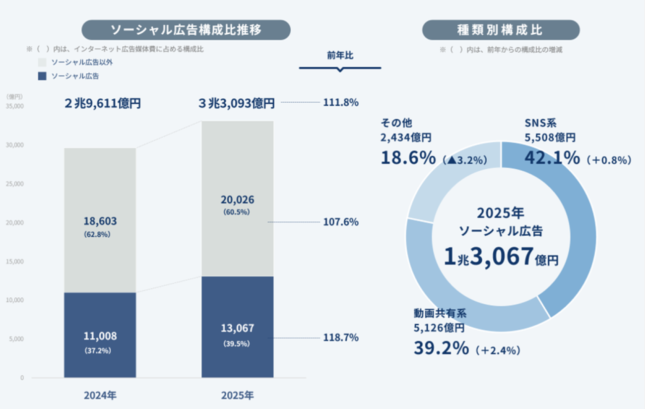 ソーシャル広告市場も成長を維持し、前年比118.7%の1兆3,067億円へ拡大した。インターネット広告媒体費全体の39.5%を占め、40%台に迫る勢いである。内訳はSNS系が5,508億円(42.1%)、動画共有系が5,126億円(39.2%)、ブログなどその他が2,434億円(18.6%)となり、動画共有系の比率が前年より増加している。