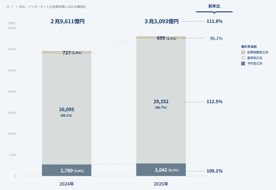 広告取引手法別では、運用型広告が前年比112.5%の2兆9,352億円となり、インターネット広告媒体費のおよそ9割(88.7%)を占めた。予約型広告は3,042億円(前年比109.1%)、成果報酬型広告は699億円(前年比96.1%)と減少傾向となった。