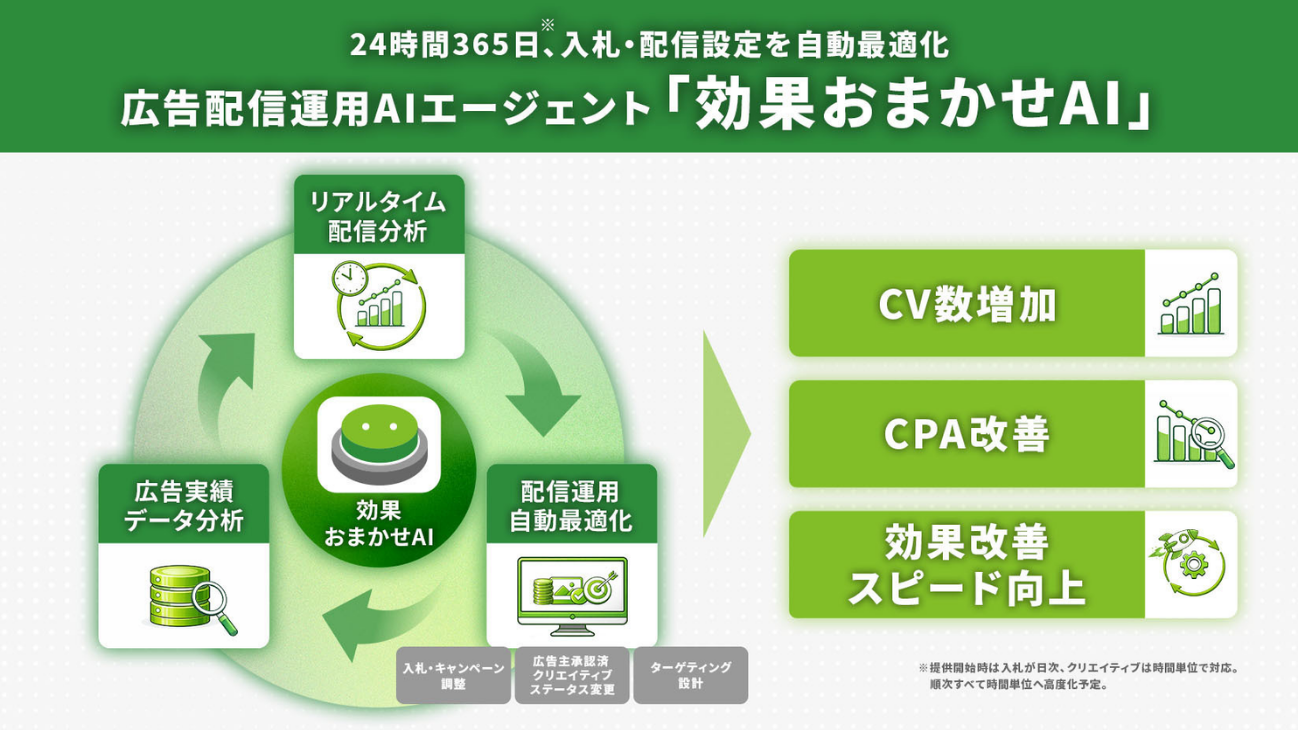 サイバーエージェントは、広告配信の入札・配信設定を自動で最適化するAIエージェント「効果おまかせAI」を2026年4月20日より提供開始する。