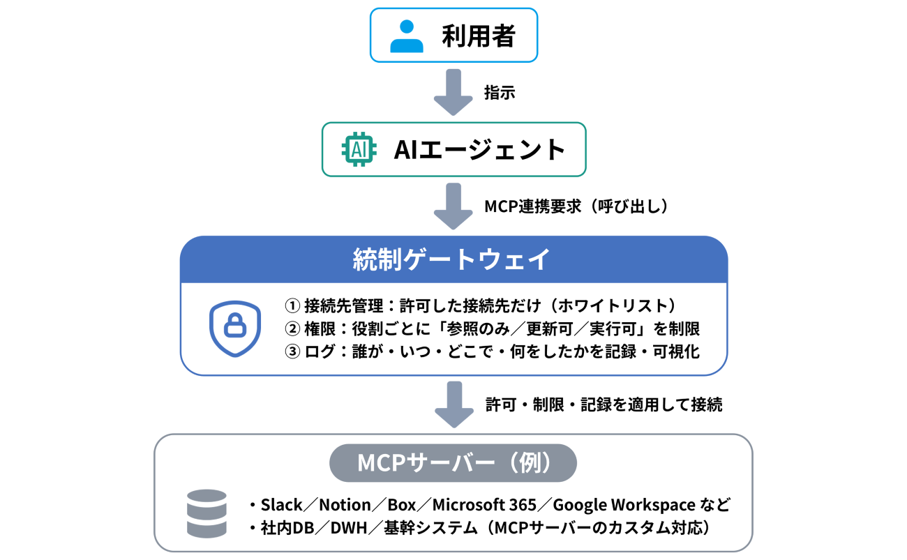 同社はMCP導入時において企業のIT管理部門が求める運用統制を実現するため、設計・実装・運用を一貫してサポートする。実施背景として、生成AIの業務活用が拡大するなか、AIエージェントが外部システムと自律的に連携する事例が増えているが、MCPは接続自体の標準化に特化しており、セキュリティやガバナンス機能は含まれていないことを指摘。接続先管理や認証、操作ログ不足などに起因するリスクが生じていたとしている。