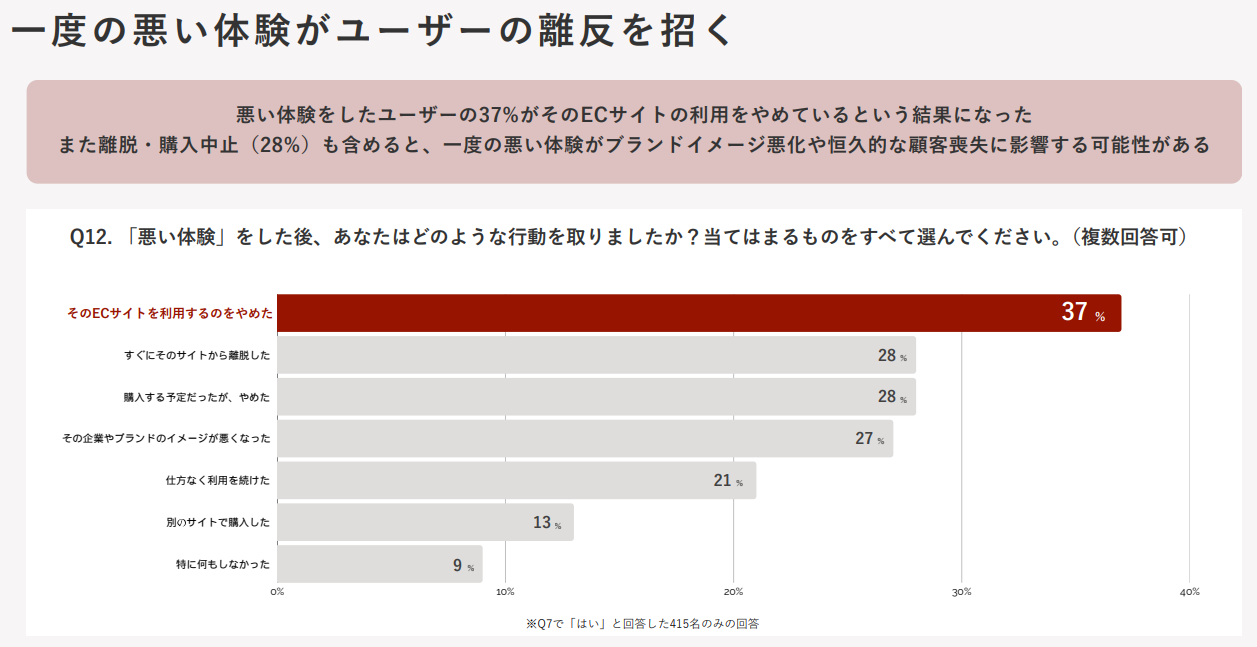 「悪い体験」があった場合、37%がそのECサイトを以後利用しなくなると回答。特に、ECサイトの利用頻度が高いユーザーほど離脱率が高く、毎日利用するユーザーのうち52.8%が即時離脱するとの結果が出ている。恒常的な顧客喪失や機会損失につながることが示唆された。