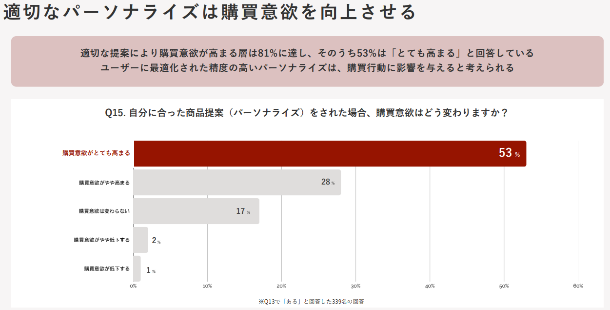 パーソナライズされた提案を受けることで、81%が購買意欲が高まると回答し、そのうち53%が「とても高まる」と答えた。精度の高いパーソナライズが売上拡大に寄与する可能性が示された。