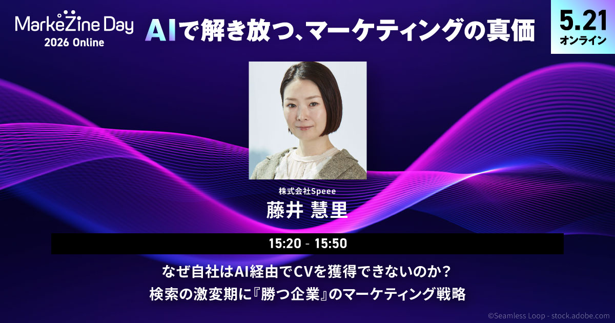MarkeZineが5月21日(木)にオンラインで開催するイベント「MarkeZine Day 2026 Online」には、SpeeeでAEOサービス推進の責任者を務めている藤井 慧里氏が登壇。『なぜ自社はAI経由でCVを獲得できないのか? 検索の激変期に「勝つ企業」のマーケティング戦略』というテーマのもと、30分で「AI検索への対策ポイント」を解説します。