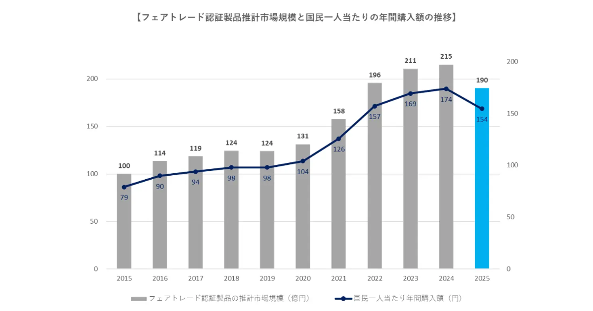 FLJが発表した2025年の国内フェアトレード市場規模は約190億円で、前年比約88%。主要原料の国際価格変動が市場に影響を及ぼした。
